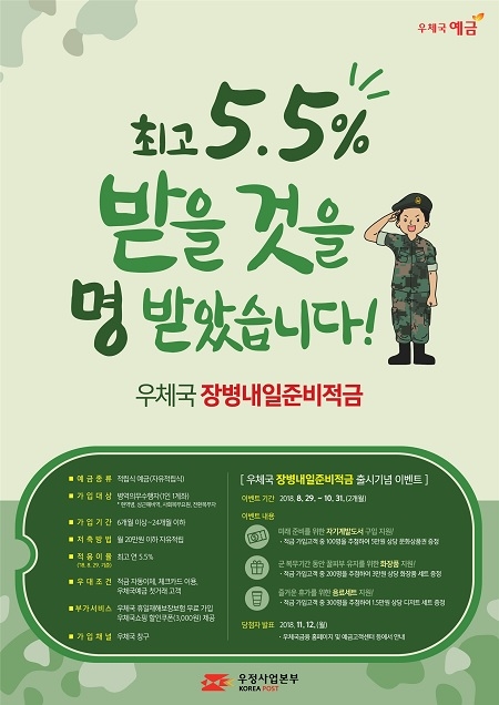 '우체국 장병내일준비적금'은 실명의 개인으로 △남은 복무기간이 6개월 이상이고 △'적금 가입 자격 확인서'를 소속부대(기관)에서 발급 받아 우체국에 제출하면 가입할 수 있다. 가입금액은 월 1만~20만원이며, 적용금리는 우대금리 포함 시 최고 연 5.5%이다.