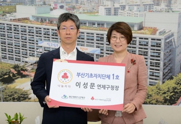 이성문 부산 연제구청장(사진 왼쪽)이 27일 부산 기초자치단체장 중에서는 처음으로 부산사회복지공동모금회 '나눔리더'에 가입했다.