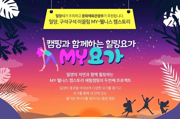 경남 밀양시는 다음달 1일부터 이틀간 밀양아리랑 오토캠핑장과 밀양강 야외공연장에서 요가전문가들과 마음의 에너지를 찾는 힐링캠핑인 'MY요가'를 진행한다고 29일 밝혔다.