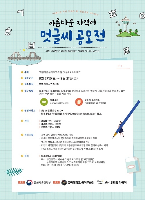 동아대학교 국어문화원은 '아름다운 지역어 멋글씨 공모전'을 다음달 21일까지 개최한다고 29일 밝혔다.