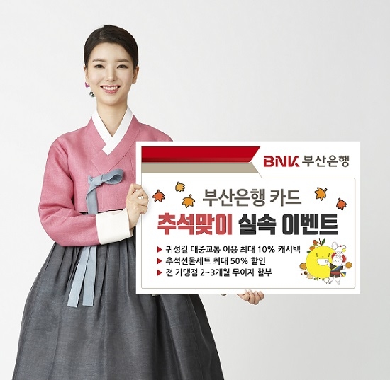 BNK부산은행은 이달부터 부산은행 개인 신용 및 체크카드 고객을 대상으로 전월 카드 이용실적이 없어도 할인해주는 '추석맞이 실속 이벤트'를 진행한다고 4일 밝혔다.