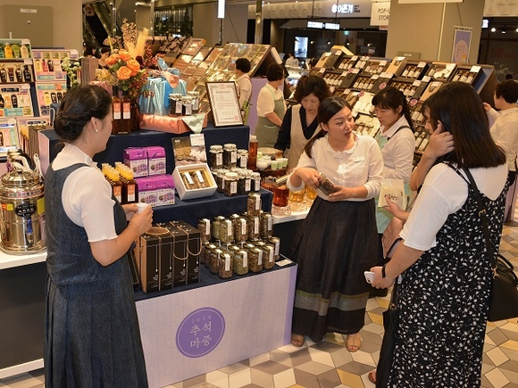 부산지역 롯데백화점이 추석을 앞두고 본격적인 추석 선물세트 진열판매에 들어간 가운데, 롯데백화점 부산본점 지하 2층 식품관에 진열된 선물을 고객들이 살펴보고 있다. (사진=롯데백화점)