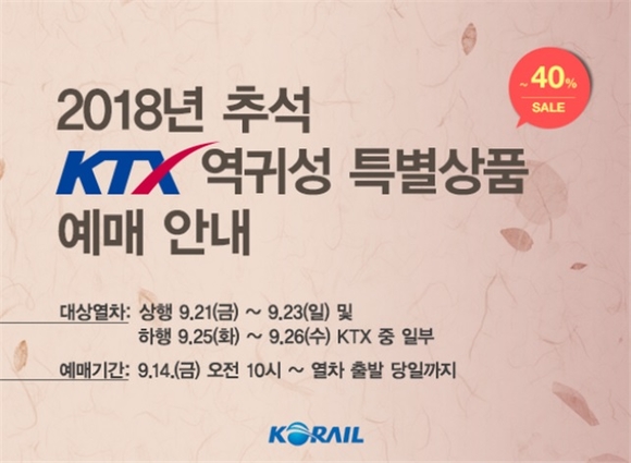 코레일 부산경남본부는 추석 명절기간 국민들의 철도 이용 편의 제공을 위해 'KTX 역귀성 특별상품'을 14일부터 판매한다고 밝혔다.
