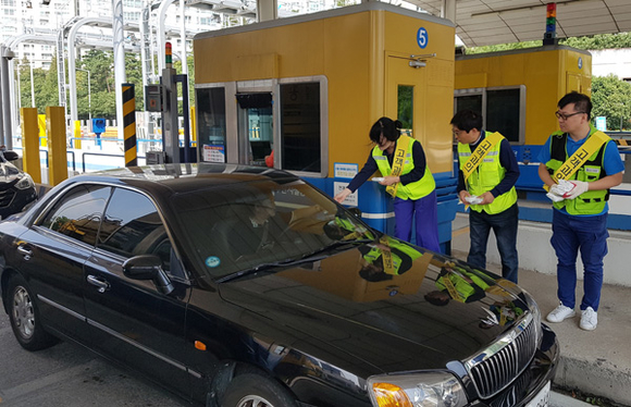 ▲18일 오후, 교량사업단 직원들이 수영강변요금소앞에서 운전자에게 물티슈를 배부하며 안전캠페인을 펼치고 있다. (사진제공=부산시설공단)