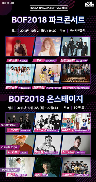 아시아 No.1 한류페스티벌 '2018 부산원아시아페스티벌(BOF2018)'이 시민과 소통하는 무료 공연의 아티스트 라인업을 공개했다.
