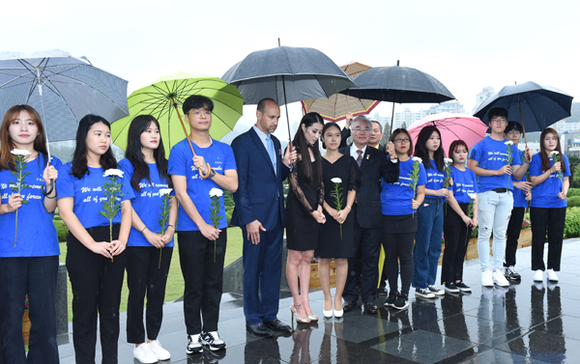 부경대학교 학생평화봉사단 UN서포터즈(대표 안태언·25·국제통상학부 3학년)가 21일 UN 세계 평화의 날을 맞아 부산 남구 UN기념공원에서 미국 찰스 랭글 전 하원의원 수석보좌관 출신 재미동포 한나 김 씨(Hanna Kim·35·여)와 세계평화의 날 기념행사를 개최했다.