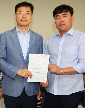 ▲경상대 교직원으로 근무하다 퇴직 후 사망한 고 이혜진 씨의 부군 박수창 씨(오른쪽)가 정우식 대외협력본부장에게 발전기금을 전달한 뒤 기념촬영을 하고 있다. (사진제공=경상대)