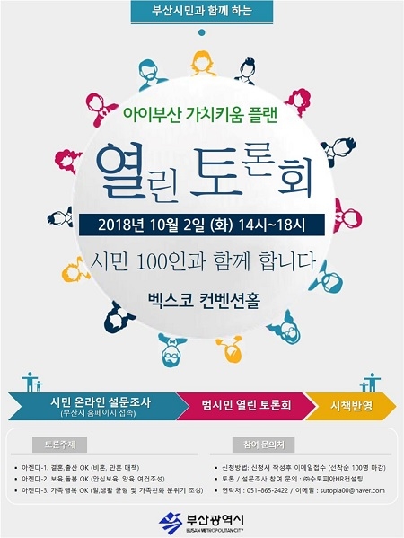 부산시는 전문가 및 일반시민이 함께하는 저출산 대응을 위한 범시민 토론회를 10월 2일 오후 2시 벡스코 컨벤션홀에서 개최한다.