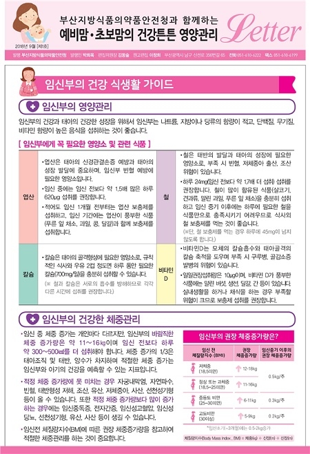 부산지방식품의약품안전청은 임산부의 건강한 식생활 안내를 위해 '예비맘·초보맘의 건강튼튼 영양관리 레터'를 발간, 28일 관내 보건소 등에 배포한다고 밝혔다.