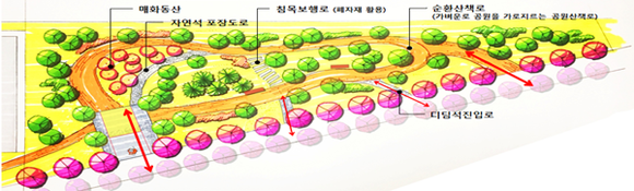 진입로엔 휴메트로의 영문 첫 글자(H) 형태를 차용한 건널목이 설치됐다. 건너자마자 만나는 매화동산에서는 흐드러지게 필 봄꽃의 향연을 감상할 수도 있다. 공원을 가로지르는 순환 산책로와 함께 폐자재를 활용한 침목보행로로 환경 보호에도 앞장섰다는 것이 공사의 설명이다.