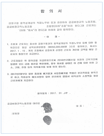 또한 이들은 2016년 구의회 행정 사무감사에서 대행 업체들의 직접 노무비 횡령 의혹이 불거지자 A씨 업체는 3억 5천만원, B씨 업체는 1억 5천만원을 환경미화원들에게 지급하면서 민·형사 책임을 묻지 않겠다는 합의서를 작성해 입막음을 시도한 사실이 드러났다.