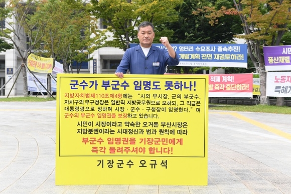 오규석 기장군수는 부군수 임명권 반환을 촉구하는 무기한 1인 시위를 업무공백을 최소화 하고자 매주 화요일 점심시간을 이용해 부산시청 시민광장 앞에서 이어나가고 있다.
