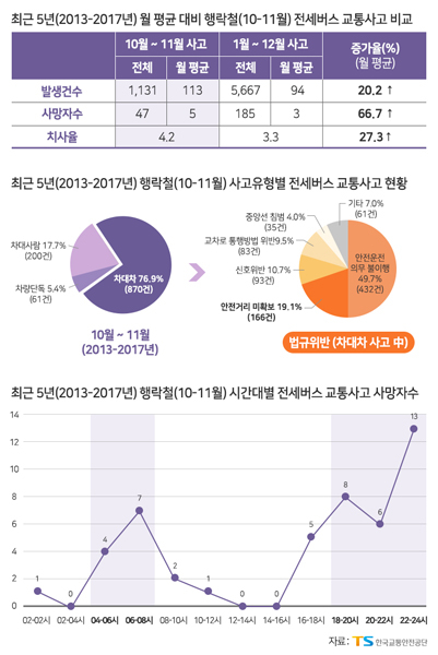 최근 5년간 10~11월 전세버스 교통사고를 분석한 결과 월평균 대비 발생건수는 20.2%, 사망자 수는 66.7% 증가한 것으로 나타났다.