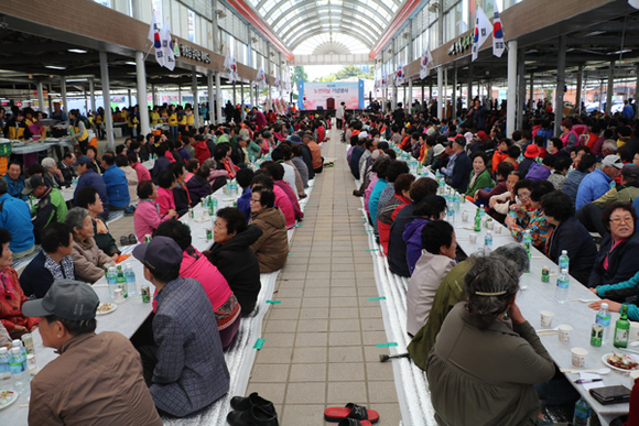 ▲11일 남창전통시장에서 한국수력원자력 새울원자력본부가 후원하고 온양읍 여성연합회가 주관한 '제22회 노인의 날 기념 경로잔치'가 열리고 있다. (사진제공=새울본부)