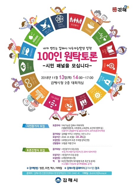 '시민이 함께 만드는 지속가능한 김해시 미래계획'이란 주제로 열리는 이날 원탁토론은 지난 2015년 UN 총회에서 건강하고 지속가능한 지구를 위해 국제사회 구성원 모두가 2030년까지 달성해야 할 지속가능발전목표(SDGs) 17개 의제를 기반으로 토론하는 자리다.