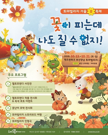 렛츠런파크 부경의 가을꽃 축제는 오는 10월 13일부터 21일 2주간 토요일과 일요일에 렛츠런파크 부경의 토마빌리지에서 진행된다.