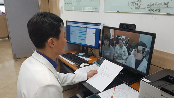 ▲고신대복음병원 최종순교수가 몽골국립병원과 원격진료 중이다. (사진제공=고신대복음병원)