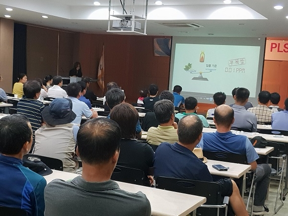이날 교육에는 사전 예보 대상자 및 교육을 희망하는 농가 50여 명이 참석했으며, PLS 시행 목적과 안전성 조사 추진 절차, 작물별 등록농약 안전사용 방법, 미등록 농약 관행적 사용 금지 등에 대한 내용으로 진행됐다.