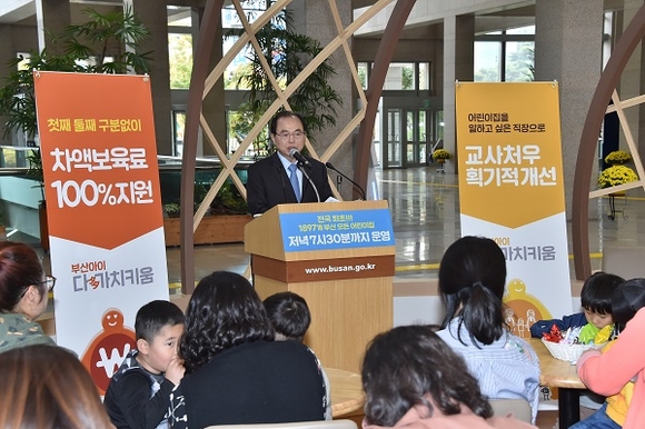 부모 양육부담 완화를 위해 영유아보육료, 가정양육수당, 차액보육료를 지원해 무상 보육을 시행한다. 특히, 부모가 부담하는 차액보육료는 그동안 첫째, 둘째 등 자녀 수에 따라 지원하던 조건을 획기적으로 개선해 자녀 수, 출생순위와 관계 없이 부산시에 거주하는 모든 아이에 대해 100% 지원하기로 했다.