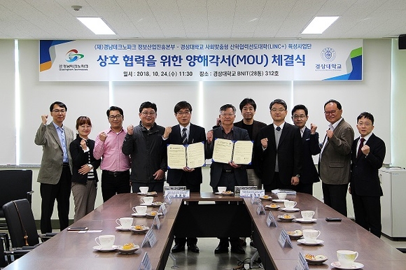 경상대학교 사회맞춤형 산학협력선도대학(LINC+) 육성사업단과 (재)경남테크노파크 정보산업진흥본부는 24일 오전 경상대 BNIT R&D센터에서 업무교류 및 기술협력으로 지역 소프트웨어(SW)산업의 발전 및 중소기업 경쟁력 강화에 기여하기 위한 양해각서(MOU)를 체결했다.