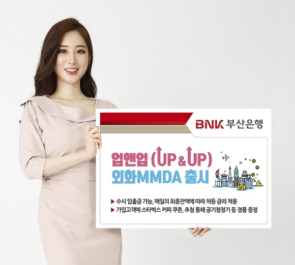 BNK부산은행은 매일 예금 잔액에 따라 금리가 차등 적용되는 수시입출금식 외화 MMDA인 '업앤업(Up & Up) 외화MMDA'를 출시했다고 27일 밝혔다.