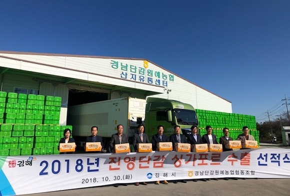 경남 김해시는 30일 경남단감원예농협 농산물산지유통센터(APC)에서 수출농협, 농가, 업체 등 12명이 참석한 가운데 진영단감 20톤을 싱가포르로 수출하는 선적식을 가졌다.