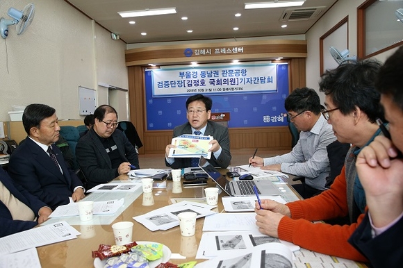 ▲'부울경 동남권 관문공항 검증단장'인 김정호 국회의원(가운데)이 31일 김해시청 프레스센터에서 기자회견을 갖고 있다. (사진=김해시)