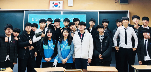 ▲DGB대학생녹색기자단이 2일 1회차로 진행된 영진고등학교 학생들을 대상으로 환경교육을 진행하고 기념촬영을 하고있다. (사진제공=DGB금융)