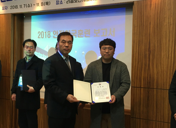 ▲국립부산과학관은 ‘2018년 안전한국훈련 평가’에서 우수기관으로 선정, 안전문화 확산 및 안전사고 예방에 기여한 공로를 인정받아 장관 표창을 수상하고 관계자들이 기념촬영을 하고 있다. (사진제공=국립부산과학관)