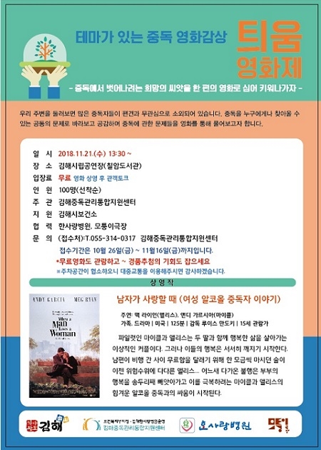 상영작은 가족문제로 알코올 중독에 빠진 평범한 가장의 모습을 그린 <남자가 사랑할 때(1994)>로 중독 원인과 해결 과정을 담고 있어 일반인과 중독자 가족에게 중독을 극복할 수 있는 희망의 메시지를 전할 것으로 보인다.