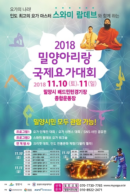 '2018 밀양아리랑 국제요가대회'가 오는 10, 11일 양일간 밀양시 배드민턴경기장과 종합운동장 일원에서 열린다.