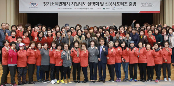 ▲캠코는 9일 오후 3시 예금보험공사 대강당에서 '장기소액연체자 지원제도 설명회 및 신용서포터즈 출범식'을 개최하고, 캠코 천경미 이사, 서울시 강북·노원·성북구 사회복지담당 공무원, 통장, 복지상담사 등 관계자들이 기념촬영을 하고 있다. (사진제공=캠코)