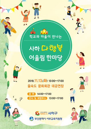 부산시서부교육지원청은 11월 13일 오후 2시부터 3시간동안 사하구와 영도구 지역 초·중학생과 학부모, 교원, 마을활동가 등 1,200여명이 참가한 가운데 '서부다행복문화예술축제'를 연다.