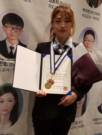 ▲와이즈유 미용예술학과 박사과정생 황수민씨가 전국기능대회에서 헤어디자인 부문 동메달을 수상하고 기념촬영을 하고 있다. (사진제공=와이즈유)