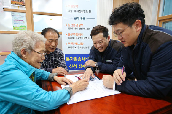 이에 고리원자력본부는 주변 지역 마을회관, 노인정 등 다중 집결 장소 곳곳을 찾아다니며 문자알림서비스를 홍보하는 활동을 지속적으로 펼쳤다.