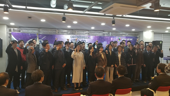 ▲13일 부산 모라동 소재 부산벤처타워에서 열린 부산청년창업사관학교 개소식에서 관계자들이 기념촬영을 하고 있다. (사진제공=부산중기청)