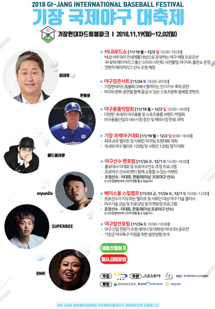 또한 평소 만나보기 힘든 프로야구 선수들과 소통할 수 있는 토크콘서트와 팬 사인회가 열린다. 홍보대사인 이대호(롯데 자이언츠)를 비롯해 손아섭(롯데 자이언츠), 박용택(엘지 트윈스), 서건창(키움 히어로즈) 등 대한민국을 대표하는 선수들이 참가해 프로야구 시즌이 종료돼 아쉬운 팬들의 마음을 달랠 수 있을 것으로 보인다.