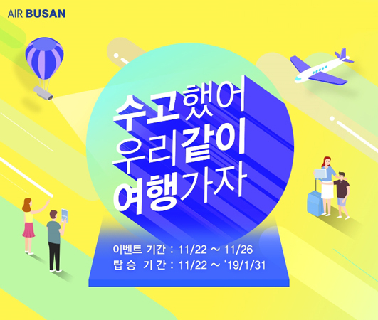 지역항공사 에어부산이 22일부터 겨울 시즌 탑승 기간의 특가 항공권을 판매하는 '수고했어' 이벤트를 실시한다고 밝혔다.