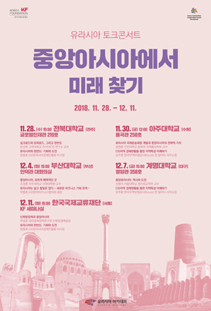 한국국제교류재단(KF)은 오는 28일부터 12월 11일까지 유라시아의 경제, 역사, 실크로드 등에 대한 10회의 강의로 구성된 '유라시아 토크콘서트-중앙아시아에서 미래 찾기'를 전북대, 아주대, 부산대, 계명대 및 서울 KF 글로벌센터에서 개최한다고 밝혔다.