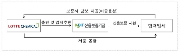신보는 협력업체가 롯데케미칼로부터 외상으로 물품을 구매할 때 지급해야할 대금지급 채무에 대해 보증(B2B담보용보증)을 지원하며, 5년간 보증료를 0.3%p 차감해 중소기업의 금융비용 부담을 완화할 예정이다.