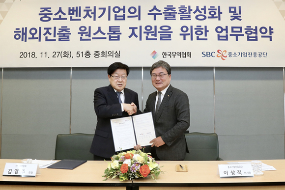 중소기업진흥공단은 한국무역협회와 서울 삼성동 트레이드타워에서 '중소벤처기업의 수출활성화 및 해외진출 원스톱 지원을 위한 업무협약'을 27일 체결했다고 밝혔다.