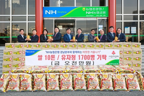 이날 행사는 어려운 이웃들이 맛있는 밥과 김치, 달콤한 차와 함께 따뜻한 겨울을 보낼 수 있도록 지난 15일 경남농협 '사랑의 김장김치 나눔' 행사에 이어 도내 사회복지시설에 쌀 500포(20kg)와 유자청 1700병을 전달하기 위해 마련됐다.