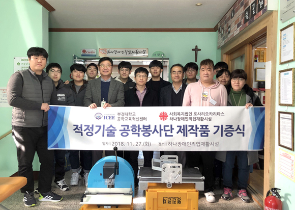 부경대학교는 공학교육혁신센터의 '적정기술공학봉사단'이 지난 27일 대학 인근 장애인직업재활시설에 도판기와 전동천공기를 전달했다고 밝혔다.