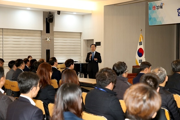 경남 김해시는 3일 문승욱 경남도 경제부지사를 초청해 직원 300명 대상으로 '함께 만드는 완전히 새로운 경남 - 다시 뛰는 경남경제'라는 주제로 특강을 실시했다.