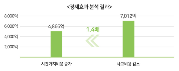 조사결과에 따르면, 최고제한속도를 시속 60km에서 50km로 낮출 때 모든 이용자의 통행시간이 2분씩 늦어나, 전국적으로 4,866억 원의 시간가치 비용이 증가하지만, 사망가능성은 30% 감소한다는 연구에 따라 지난해 기준 보행사망자 1,675명 중 503명의 목숨을 구하는 효과를 기대 할 수 있다.