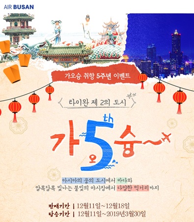 에어부산은 '부산-가오슝' 노선 취항 5주년을 맞아 특가 이벤트를 실시한다고 10일 밝혔다.