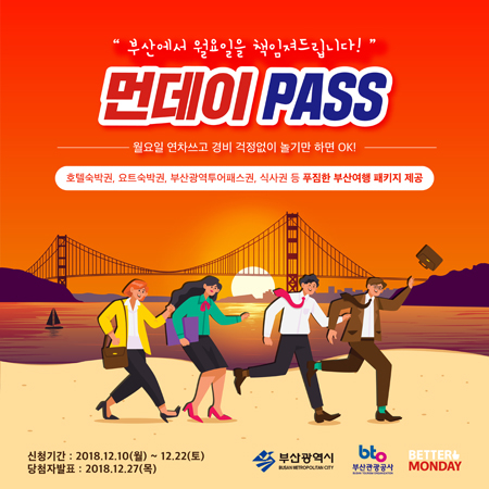 공사는 '베러먼데이'와 함께 부산여행패키지 및 찾아가는 해피 월요일 서비스를 지원하는 캠페인을 진행한다. 참가 신청자 중 총 17팀을 선정해 호텔숙박권, 요트탑승권, 부산광역투어패스권, 식사권 등 푸짐한 부산여행 패키지를 제공한다.