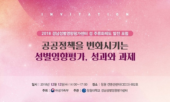 창원대학교 경남성별영향평가센터는 오는 12일 오후 2시 창원컨벤션센터(CECO) 602호 회의장에서 '공공정책을 변화시키는 성별영향평가, 성과와 과제'라는 주제로 성 주류화제도 발전 포럼을 개최한다고 11일 밝혔다.