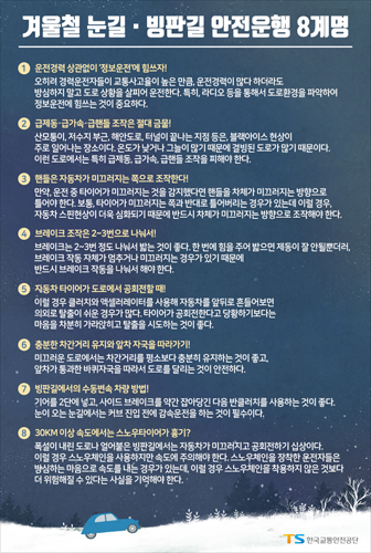 이에 따라 공단은 겨울철 교통사고 예방을 위해 조향방법, 브레이크 작동 요령 등 안전 운행 방법을 소개하는 '눈길·빙판길 안전운전 8계명'을 국민에게 알릴 예정이다.