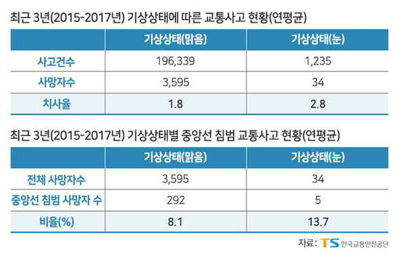 한국교통안전공단은 최근 3년간('15~'17년) 기상상태에 따른 교통사고 현황을 분석한 결과, 눈길 교통사고의 치사율이 맑은 날에 비해 1.6배 높게 나타났다고 12일 밝혔다.
